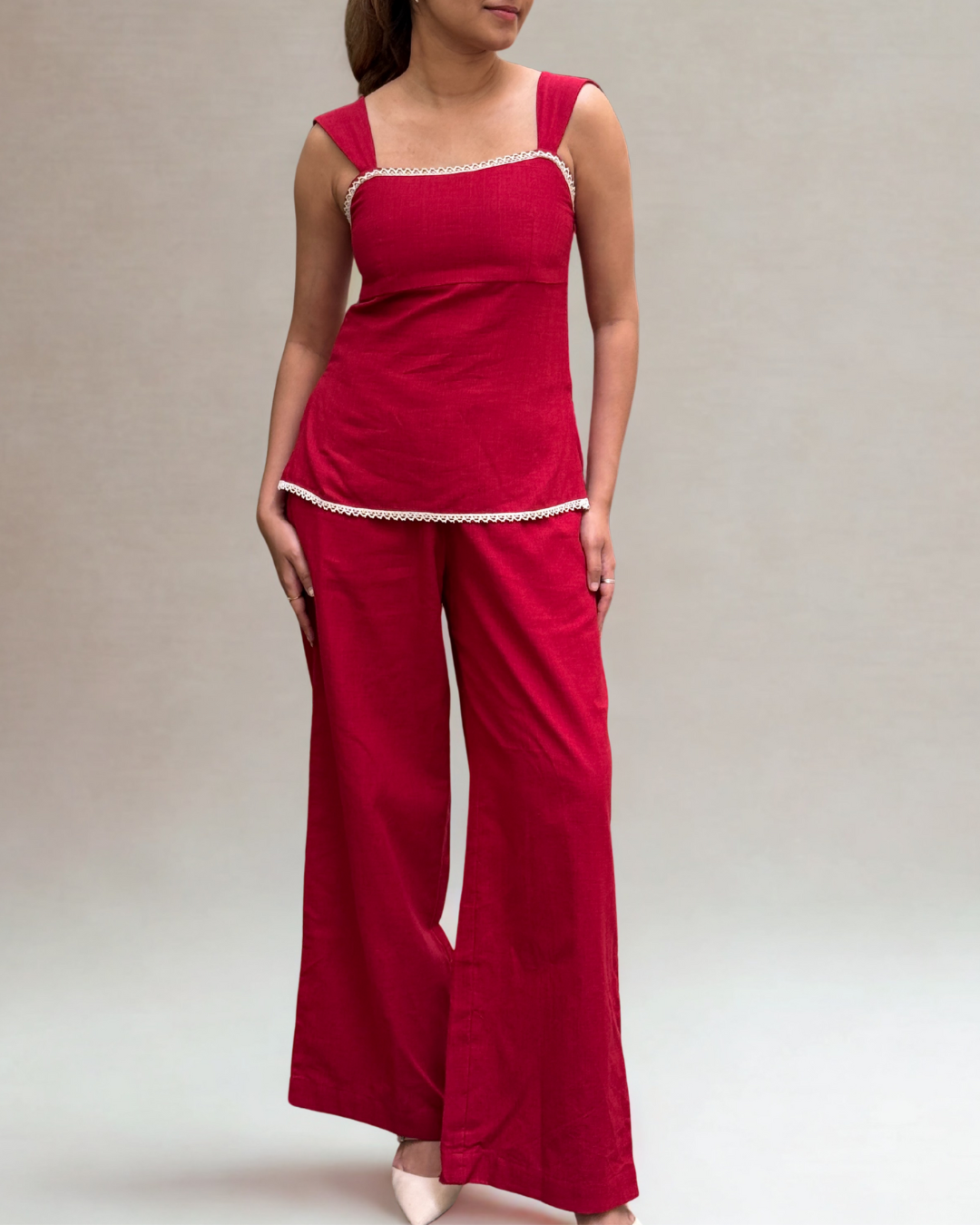 Squared neck sleeveless cotton top with delicate lace borders and side slits for ease.
