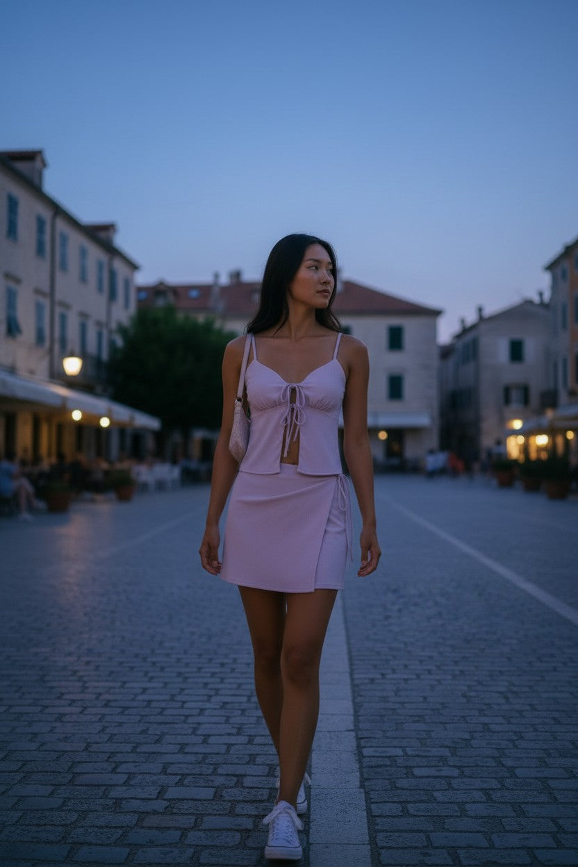 Breezy cami top with a flattering tie-front detail at the bust and adjustable spaghetti straps. Fully lined for a non-sheer finish with a built-in structure that offers natural support, no padding needed.